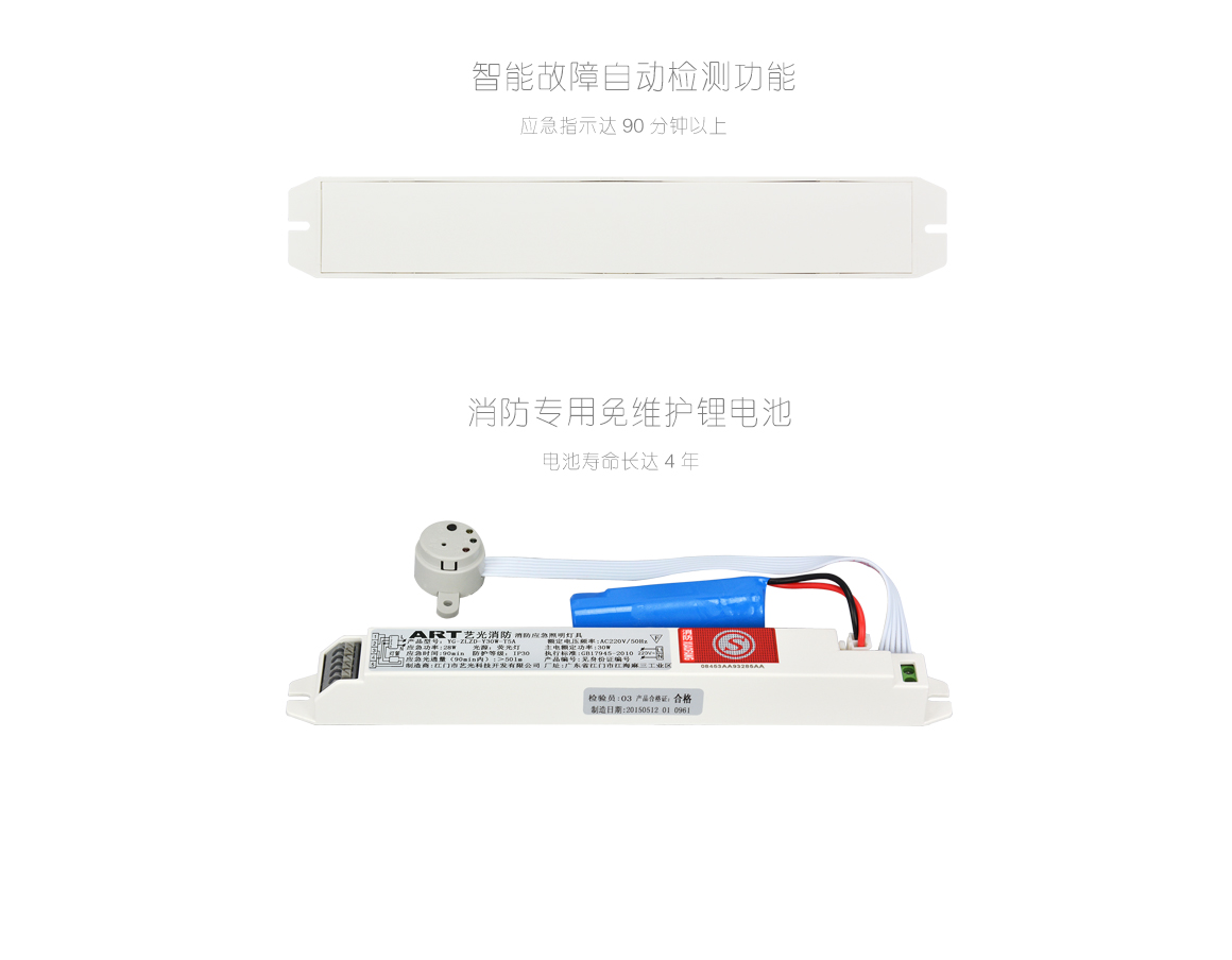 產品型號: T5A可驅動燈具:(28W、1.15米),(21W、0.85米),(14W、0.55米)T5熒光燈管 (36W、1.2米),(30W、0.9米),(18W、0.6米)T8熒光燈管應急時間: ≥90分鐘( 超長應急)電池類型: 鋰電池ZD3.7V 2200mAh產品尺寸: 282*24*22.5mm執(zhí)行標準: GB17945-2010新國標