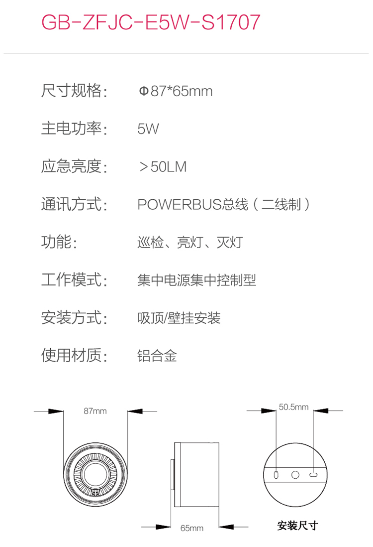 產(chǎn)品型號(hào):S1707主電功率:5W安裝方式:吸頂/壁掛安裝防護(hù)等級(jí):IP30產(chǎn)品尺寸:Φ87*65mm