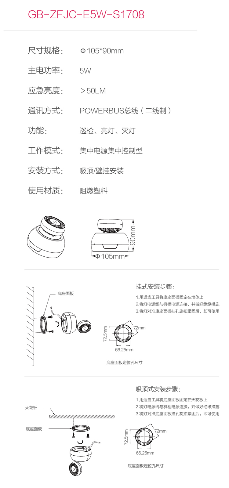 產(chǎn)品型號:S1708主電功率:5W安裝方式:吸頂/壁掛安裝防護(hù)等級:IP30產(chǎn)品尺寸:Φ105*90mm