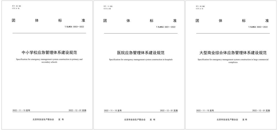 北京市應(yīng)急管理局牽頭組織的《中小學(xué)校應(yīng)急管理體系建設(shè)規(guī)范》《醫(yī)院應(yīng)急管理體系建設(shè)規(guī)范》《大型商業(yè)綜合體應(yīng)急管理體系建設(shè)規(guī)范》3項(xiàng)團(tuán)體標(biāo)準(zhǔn)于今日即2022年12月1日起正式實(shí)施。