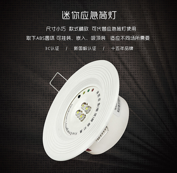 二、安裝方式靈活多樣。此款應(yīng)急筒燈在取下ABS圓環(huán)后,可掛裝、可嵌入、可吸頂安裝,多種安裝方式滿(mǎn)足各種場(chǎng)所的安裝要求。