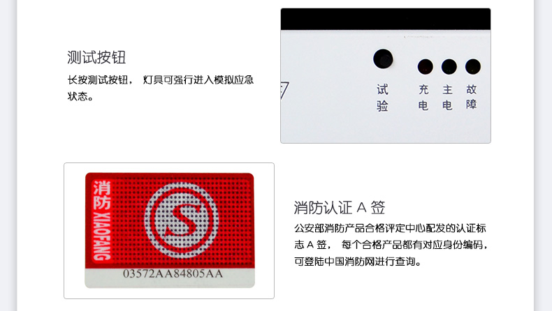 測(cè)試按鈕讓你體驗(yàn)?zāi)M應(yīng)急狀態(tài);消防認(rèn)證A/B簽方便你登錄中國(guó)消防網(wǎng)進(jìn)行產(chǎn)品查詢;