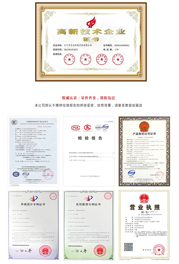 藝光科技15年的品牌實力,權(quán)威證書,資質(zhì)品質(zhì)全都有,15年的發(fā)展歷程中,藝光科技先后被評為國家高新技術(shù)企業(yè),江門市照明行業(yè)先進企業(yè)等,同時藝光科技專注于做自己的品牌,設(shè)有專門的研發(fā)團隊,擁有五十多項專利。產(chǎn)品認證齊全,輕松通過消防檢查。
