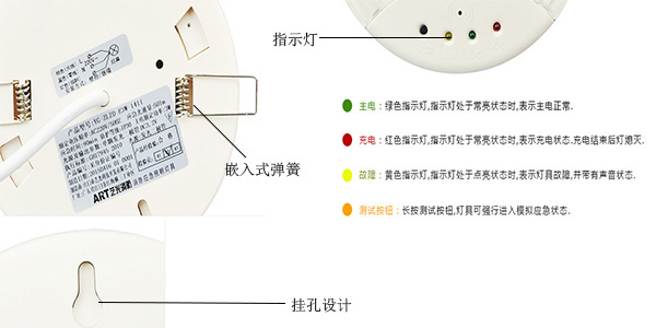 便利的細節(jié)它也有,方便掛于墻體的掛孔設(shè)計,嵌入式夾緊彈簧,燈具狀態(tài)提示燈,這些細節(jié)讓你使用應(yīng)急吸頂燈更加便利。