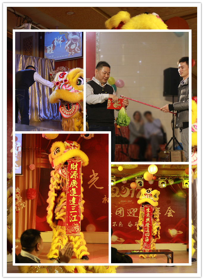 首先是由業(yè)務(wù)部同事獻上的開場秀——醒獅,象征著來年的興旺和吉祥。俗話說,“金鼓一響黃金萬兩”“金獅點精富貴繁榮”,張總上臺進行點睛儀式并為醒獅掛青。醒獅舞動,帶來吉祥如意、事事平安。