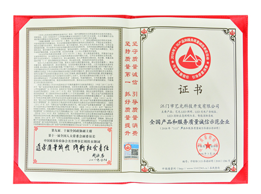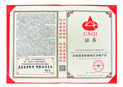 除此以外,中國(guó)質(zhì)量檢驗(yàn)協(xié)會(huì)針對(duì)藝光在2015-2018年度2月經(jīng)營(yíng)產(chǎn)品的檢定情況、生產(chǎn)條件以及售后服務(wù)進(jìn)行了全面審查,授予“全國(guó)產(chǎn)品和服務(wù)質(zhì)量誠(chéng)信示范企業(yè)”,并認(rèn)定藝光品牌LED照明、LED光電廣告制品、LED消防應(yīng)急照明燈具、智能疏散指示應(yīng)急照明系統(tǒng)等全系列產(chǎn)品為“全國(guó)質(zhì)量檢驗(yàn)穩(wěn)定合格產(chǎn)品”